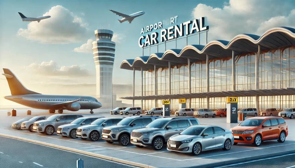 A modern airport car rental scene featuring compact cars, sedans, and SUVs parked outside an airport terminal, symbolizing convenience and stress-free travel for passengers.