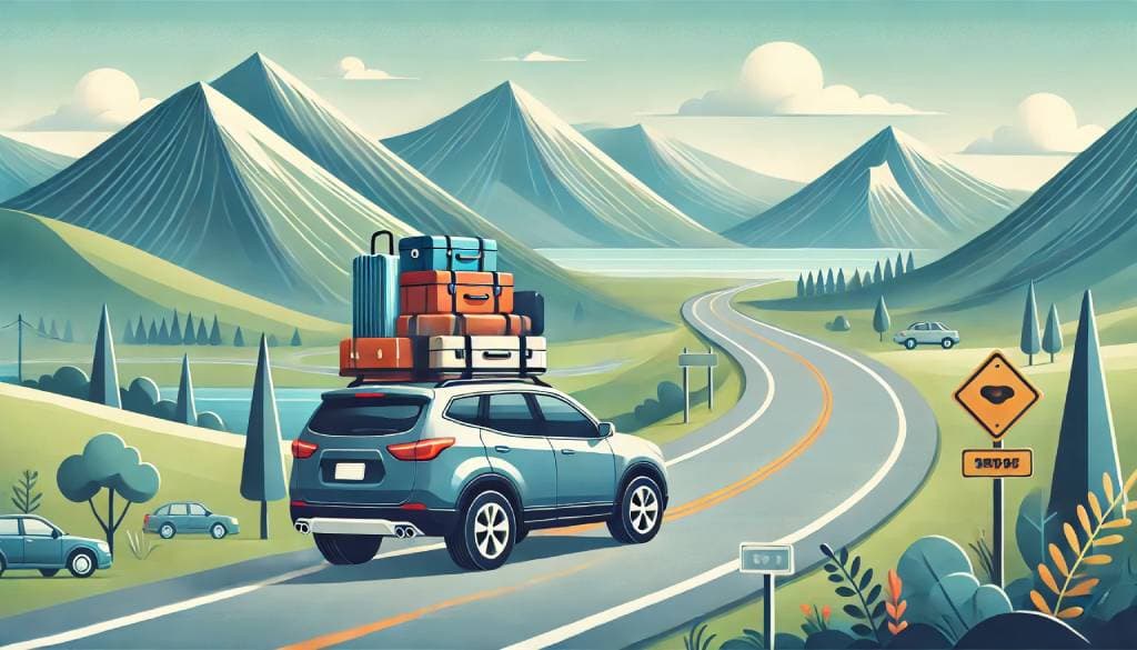 A modern SUV packed with luggage on the roof driving on an open highway, surrounded by mountains and blue skies, symbolizing the adventure and freedom of road trips.